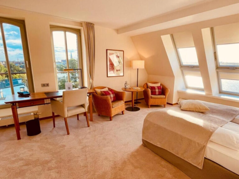 inkl. Frühstück und "SpeichersInklusive" die schönsten Zimmer unterm Dach mit Weitblick und Teestation, 180er Bett mit getrennten Matratzen, Abb. Zimmer 608 ist ein Beispiel